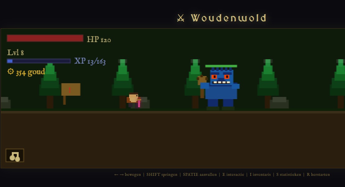A short, absurd folkloric action RPG in faux-medieval Dutch, where you battle through the twisted woods of Woudenwold to defeat a wayward wizard.